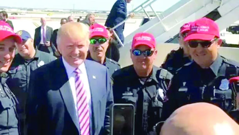 وأظهر تسجيل مصور نشر على صفحة ترامب بموقع «تويتر» أكثر من عشرة من أفراد الشرطة وهم يرتدون الزي الرسمي ويضعون القبعات الحمراء التي تحمل شعار حملة ترامب أثناء وقوفهم معه في المطار.