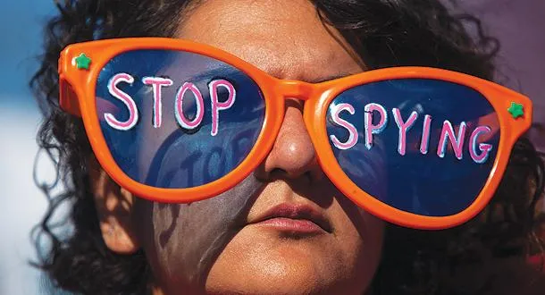 سيدة أميركية ترتدي نظارة كتب عليها «توقفوا عن التجسس» خلال مظاهرة ضد برامج التنصت الأميركي شارك فيها المئات أمام البيت الأبيض أمس (أ.ف.ب)