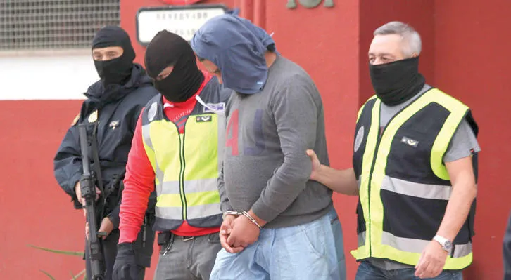رجال الأمن الإسباني يقتادون أحد المشتبه بهم في الانتماء لتنظيم «داعش» في مدينة سبتة أمس (إ.ب.أ)