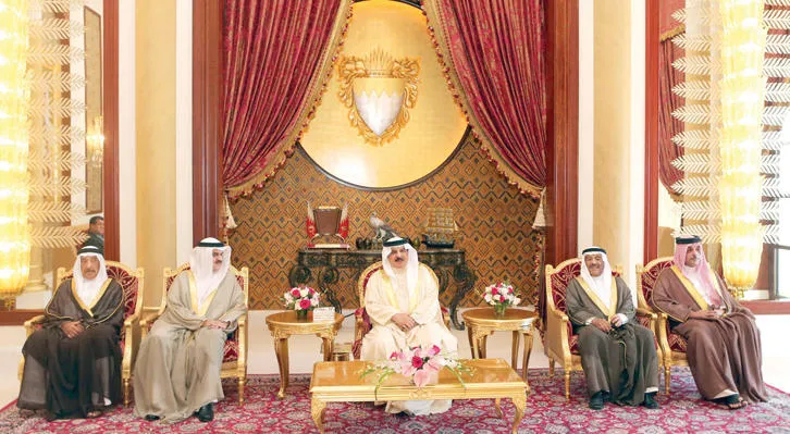 العاهل البحريني لدى استقباله رئيس مجلس النواب ورئيس مجلس الشورى وعددا من أعضاء المجلسين الذين رفعوا التقرير السنوي (بنا)