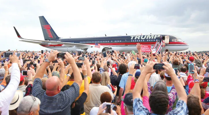 المرشح الجمهوري دونالد ترامب أثناء وصوله إلى مطار ليكلاند بفلوريدا حيث عقد فعالية انتخابية كبيرة أول من أمس (أ.ف.ب)
