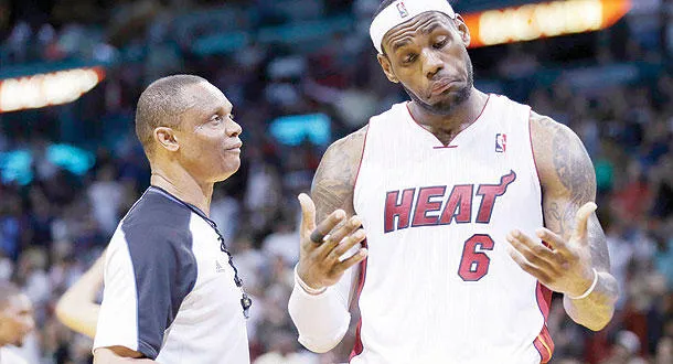 ليبرون جيمس من ميامي هيت يعترض على أحد قرارات الحكم (أ.ف.ب)