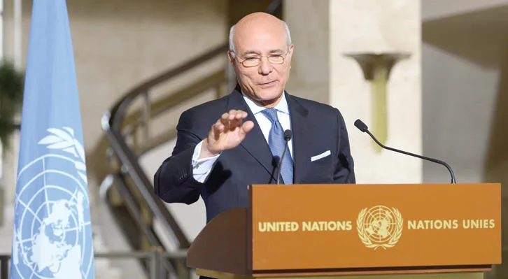 رمزي عز الدين نائب المبعوث الأممي إلى سوريا ديمستورا في مؤتمر صحافي في جنيف (إ.ب.أ)