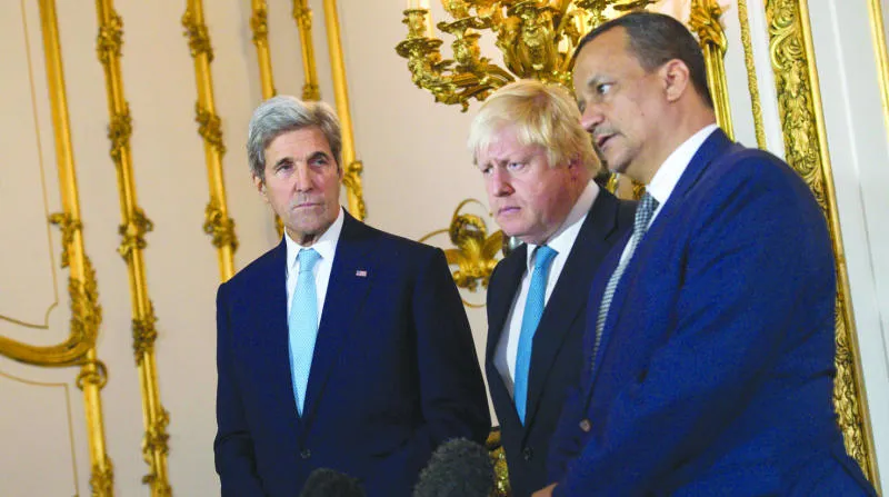 وزيرا الخارجية الأميركي والبريطاني مع المبعوث الدولي لليمن خلال تحدثهم بمؤتمر صحافي في لندن أمس (أ.ف.ب)