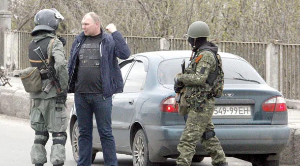 مسلحان مواليان لروسيا يتحدثان إلى سائق سيارة عند نقطة تفتيش في الطريق الرابط بين مدينتي خاركيف ودونيتسك الواقعتين في شرق أوكرانيا أمس (أ.ف.ب)