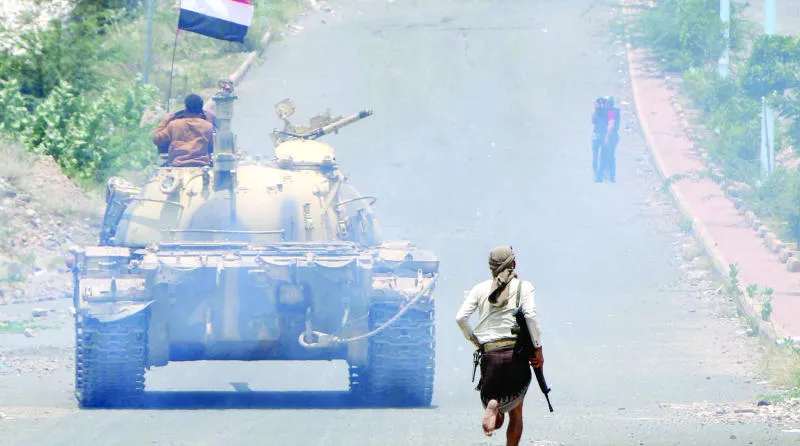 مقاتل موال للشرعية يجري خلف دبابة تحمل العلم اليمني في مدينة تعز (أ.ف.ب)