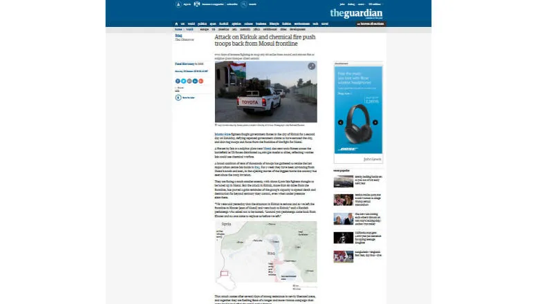 ويضيف نقلاً عن خبراء أمنيين أميركيين أن العائق الثاني في طريق إنهاء العملية سريعًا هو المفاوضات بين القادة العسكريين والحكومة بشأن تعويض عائلات القتلى والمصابين في القتال ضد تنظيم داعش، فالعسكريون لا يريدون إنهاء عملية سرت قبل التوصل إلى اتفاق بشأن المبالغ التي تحصل عليها العائلات، حسب كامبل. أما «إندبندنت» نشرت موضوعا لباتريك كوبيرن بعنوان «قارنوا تغطية المعارك في الموصل وحلب لتعرفوا الكثير عن الدعاية التي توجه لنا». يقول كوبين إن المعارك تدور في سوريا في منطقة حلب وفي العراق في الموصل وتقوم وسائل الإعلام بتغطية المعارك في الدولتين لكن الفروق كثيرة.