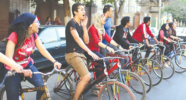 ناشطون مصريون خلال مشاركتهم في فعاليات «ماراثون الحرية» في القاهرة اعتراضا على قانون التظاهر أول من أمس (رويترز)