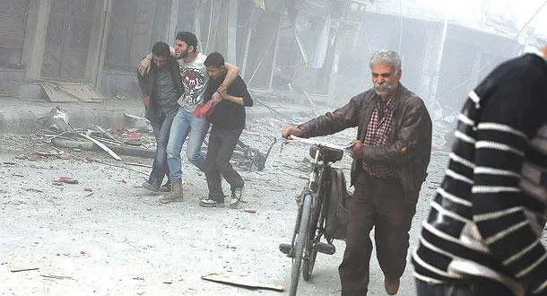 مواطنون في مدينة دوما يحاولون الهرب من الأتربة الناجمة عن قصف جوي للنظام السوري أمس (أ.ف.ب)
