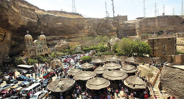 مئات من المسيحيين المصريين خلال احتفالهم أمس بيوم أحد السعف في دير القديس سمعان بضاحية المقطم شرق القاهرة (إ.ب.أ)
