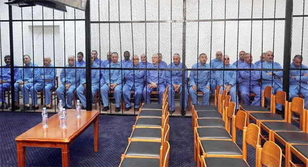 ومثل الرئيس السابق للمخابرات عبد الله السنوسي ورئيس آخر حكومة في عهد القذافي البغدادي المحمودي في قفص الاتهام مع 22 من المسؤولين السابقين الآخرين وهم يرتدون زي السجن الأزرق.