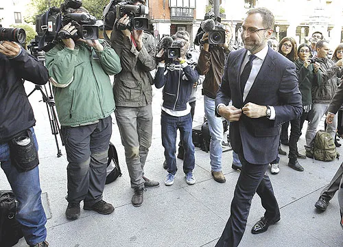 السفير الأميركي لدى إسبانيا جيمس كوستوس لدى وصوله إلى وزارة الخارجية الإسبانية أمس بعد استدعائه للاحتجاج على التنصت (إ.ب.أ)