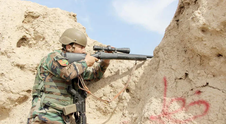 جندي أفغاني يصوب بندقيته إلى مواقع عناصر «طالبان» في ولاية هلمند أمس (إ.ب.أ)