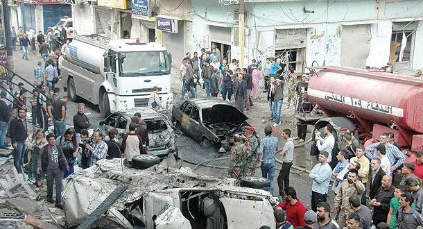 سوريون يعاينون الدمار الذي خلفه انفجار سيارة مفخخة في حمص أمس (أ.ف.ب)