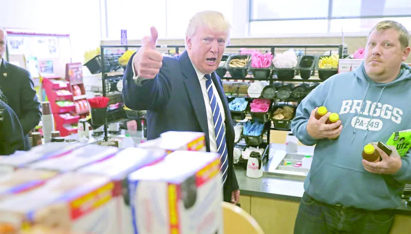 المرشح الجمهوري دونالد ترامب خلال توقفه في محطة استراحة في طريقه إلى بنسلفانيا أمس (أ.ف.ب)