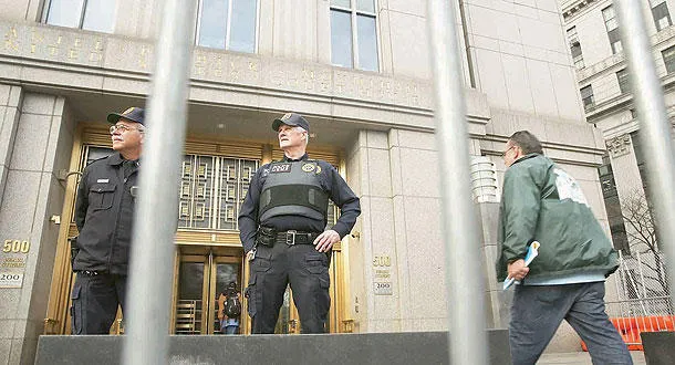 جنود شرطة ومسؤولو أمن أمام محكمة مانهاتن الفيدرالية التي يمثل أمامها أبو حمزة المصري اليوم (أ.ف.ب)