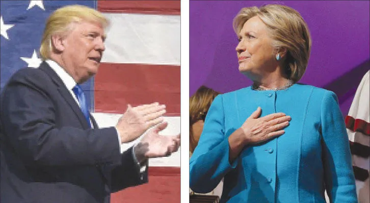 هيلاري كلينتون تحشد التأييد في كنيسة بفيلادلفيا أمس (رويترز).. ودونالد ترامب في تجمع انتخابي بـ{سو سيتي} في أيوا (أ.ف.ب)