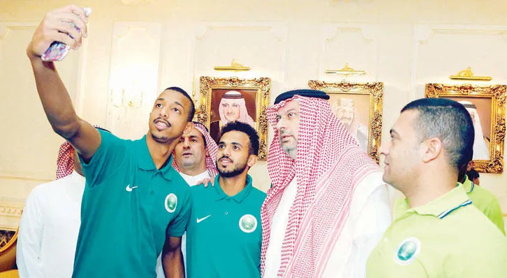 لاعبو المنتخب السعودي للشباب يلتقطون «سيلفي» مع الأمير عبد الله بن مساعد لدى استقباله لهم أمس («الشرق الأوسط»)