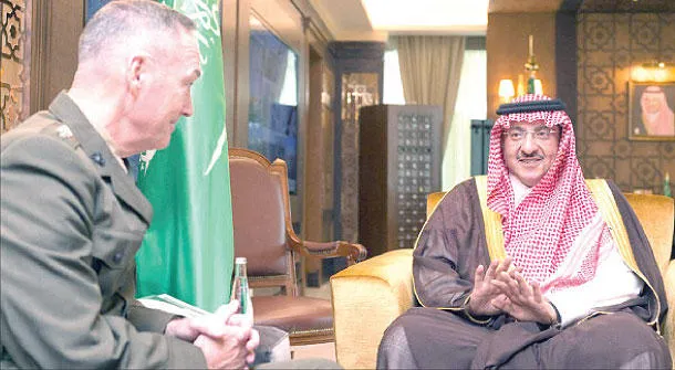 الأمير محمد بن نايف ولي العهد السعودي لدى لقائه رئيس هيئة الأركان المشتركة الأميركية (واس)