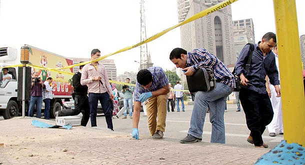 رجال أمن وبحث جنائي خلال تفحص آثار الانفجار الذي استهدف نقطة شرطة بمحافظة الجيزة جنوب غربي العاصمة المصرية أمس (إ.ب.أ)