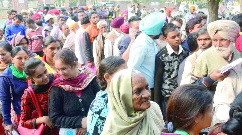 مئات من القرويين الهنود يتجمعون أمام أحد البنوك لتحويل الفئات الملغاة من العملة في عملية شهدت ارتباكًا وجدلاً وتصاعدًا للانتقادات (أ.ف.ب)