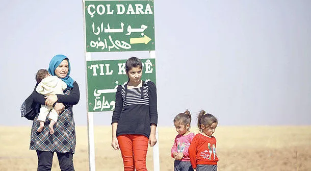 كردية مع أطفالها عند مدخل قرية الشجرة في مدينة القامشلي وهي جزء من مشروع طموح للأكراد في المنطقة (أ.ف.ب)