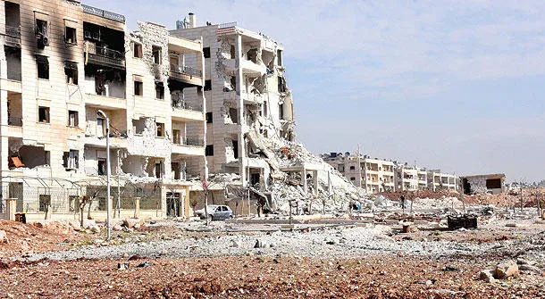 مبان مدمرة في منيان بحلب إثر قصف قوات النظام السوري وحلفائها (أ.ب)