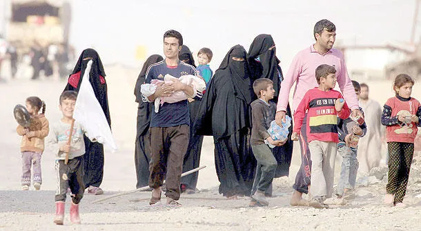 هاربون من القتال يبحثون عن مكان آمن في حي السماح بالجانب الأيسر من الموصل (أمس)