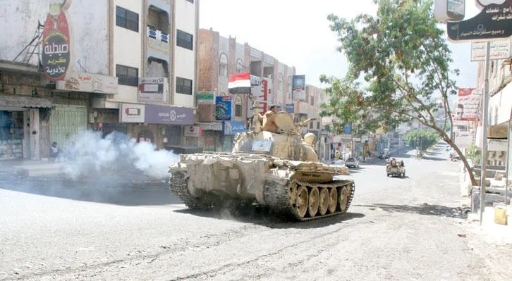 دبابة تابعة للقوات المؤيدة للشرعية في أحد شوارع تعز أمس (رويترز)