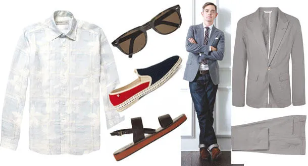 بدلة خفيفة من الكتان من آن ديمولميستر Ann Demeulemeester - توبي بايتمان مدير قسم الشراء في مستر بورتر - نظارات شمسية من «كاتلر آند غروس» (Cutler and Gross) - حذاء صيفي من «ريفيراز» (Rivieras) - صندل من «غوتشي» (Gucci) قميص من «إيترو» (Etro)