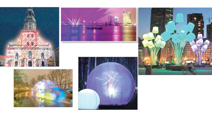 مجسمات لزهور عملاقة في ساحات المدينة لبث البهجة في النفوس خلال المهرجان («الشرق الأوسط») - لوحات من نسيج تقليدي ترسمها الإضاءة الفنية على واجهات المباني في مهرجان «ريغا تشع نورًا» - بالونات مهرجان «ريغا تشع نورًا» ترسم الأمنيات بالإضاءة الملونة - جانب من الأنوار المميزة