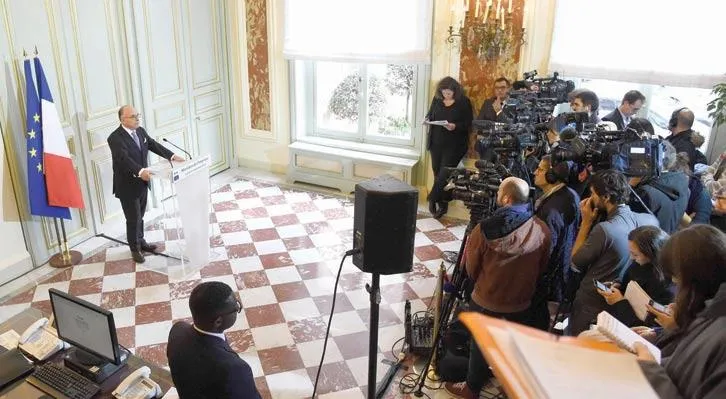 وزير الداخلية الفرنسي برنارد كازينوف يتحدث لرجال الإعلام بعد اعتقال خلية إرهابية كانت تخطط لتنفيذ اعتداءات كبيرة في فرنسا (أ.ف.ب)