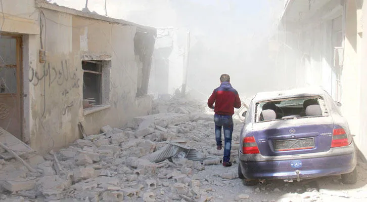 شاب من بلدة بنش بريف إدلب شمال سوريا يبحث عن ملاذ وسط أبنية مدمرة استهدفها الطيران الروسي الثلاثاء الماضي(أ.ف.ب)