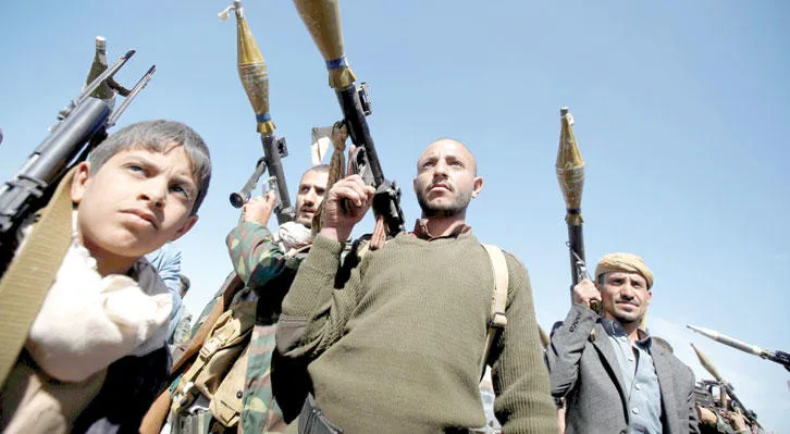 قوات موالية لانقلابيي اليمن خلال استعراض بالأسلحة في صنعاء أمس.. ويبدو طفل مسلح بينهم (رويترز)