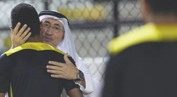 باعشن رئيس الاتحاد يحيي أحد لاعبيه بعد المران الأخير (المركز الإعلامي بنادي الاتحاد)