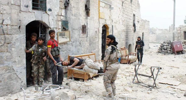 مقاتلون سوريون ينقلون جريحا لإسعافه بعد إصابته أثناء مواجهات مع قوات النظام في حلب أمس (أ.ف.ب)