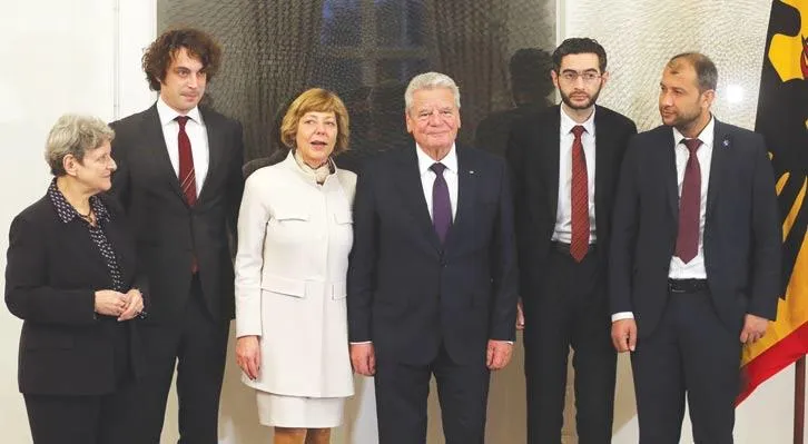 الرئيس الألماني يواكيم جوك وزوجته يرحبان في برلين، أمس، بالفائزين بجائزة نوبل البديلة التي تضم ناشطة حقوقية روسية وتركيا بالإضافة إلى رائد صالح وفاروق حبيب ممثلين عن «الخوذ البيضاء» وهي منظمة دفاع مدني سورية رشحت لنوبل للسلام (إ.ب.أ)