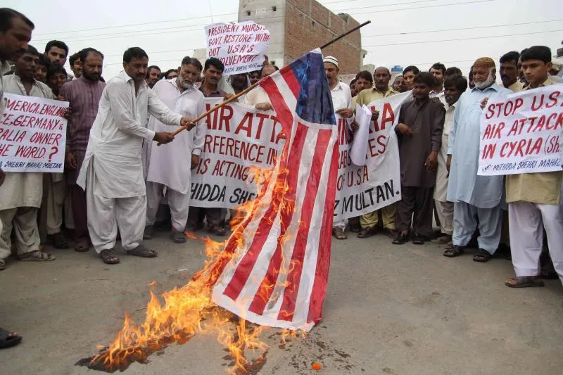 باكستانيون في مظاهرات خرجت الشهر الماضي يحرقون العلم الأميركي احتجاجا على الغارات الأميركية على أراضيهم (أ.ف.ب)