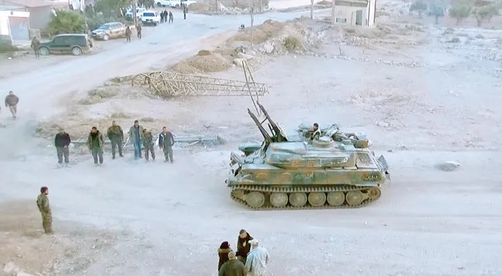 دبابة تابعة لقوات النظام مع عناصر من ميليشيات موالية لها في بلدة خان الشيخ بعد استكمال عملية خروج الفصائل المسلحة المعارضة منها (غيتي)