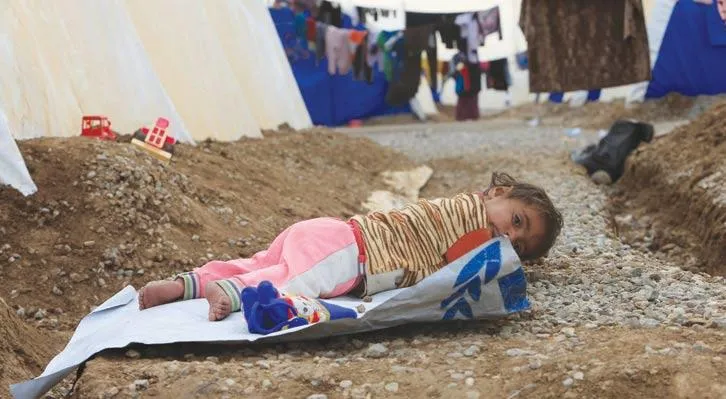 طفل عراقي هربت عائلته من مناطق يسيطر عليها «داعش» في الموصل يستلقي وسط خيام معسكر الخازر (رويترز)