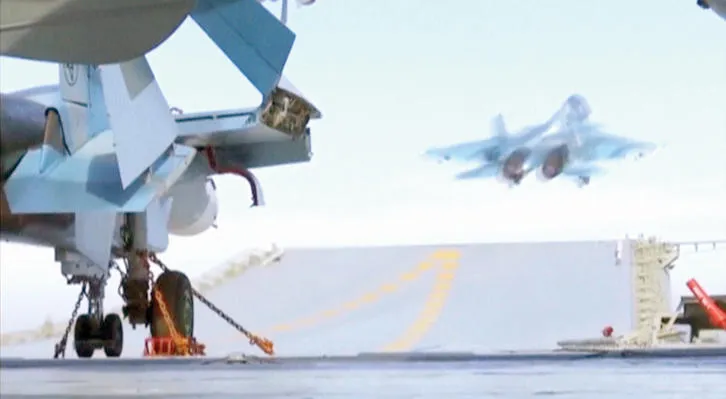 صورة وزعتها وزارة الدفاع الروسية لطائرات روسية تشارك في الغارات الجوية على سوريا منطلقة من حاملة طائرات قبالة الساحل السوري (رويترز)