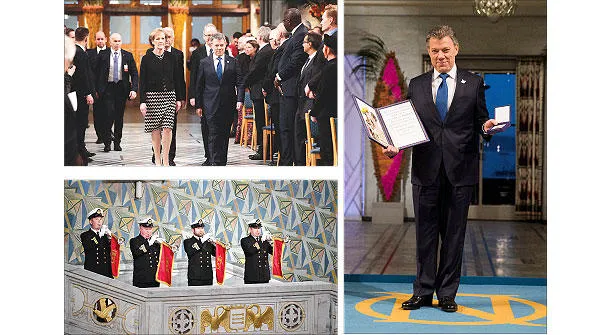ففي أوسلو عاصمة النرويج تسلم الرئيس الكولومبي خوان مانويل سانتوس جائزة السلام تقديرا لجهوده في التوصل لاتفاق سلام مع المتمردين، في حفل حضره ملك وملكة النرويج وأعضاء الحكومة وممثلون عن ضحايا النزاع ورهينتان سابقان لدى منظمة فارك الماركسية.