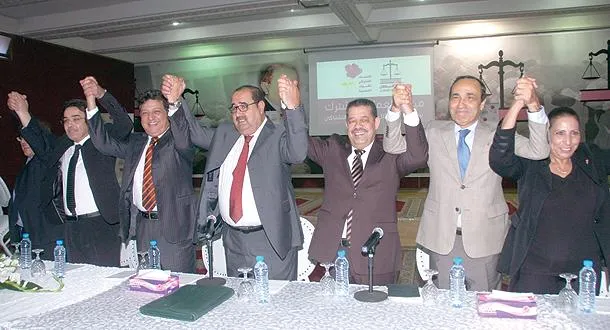 حميد شباط الأمين العام لحزب الاستقلال، وإدريس لشكر الأمين العام لحزب الاتحاد الاشتراكي، وأعضاء من المكتب السياسي للحزبين، بعد التوقيع على وثيقة العمل المشترك في الرباط أمس (تصوير: مصطفى حبيس)