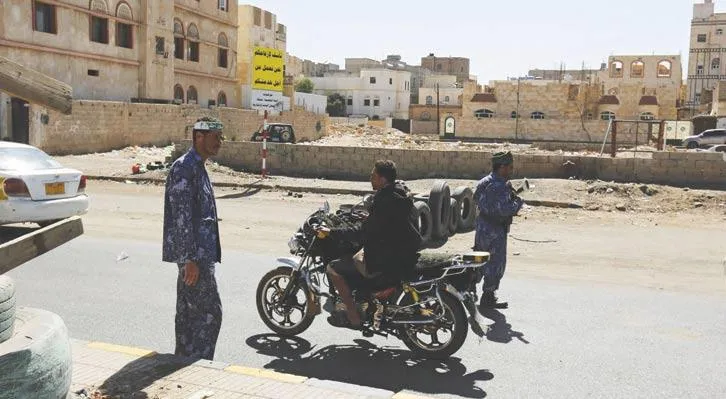 عنصران من الميليشيات الحوثية لدى نقطة تفتيش في صنعاء مساء أول من أمس (إ.ب.أ)