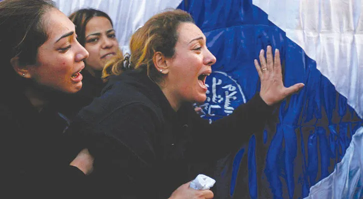 مواطنات مصريات خلال تشييع جثامين ضحايا الكنيسة البطرسية في جبانة المقطم بالقاهرة أمس (رويترز)