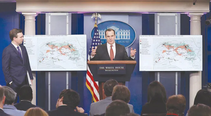 برت ماكغواير مبعوث البيت الأبيض للتحالف الدولي ضد «داعش» والمتحدث الإعلامي باسم البيت الأبيض جون أرنست يتحدثان حول الأوضاع في سوريا مساء أمس (أ.ب)