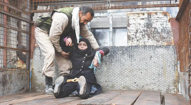 رجل يسعف امرأة أصيبت أثناء محاولتها الفرار من المواجهات الدائرة بين قوات النظام وفصائل المعارضة في إحدى المناطق التي لا تزال تحت سيطرة المعارضة بحلب الشرقية أمس (أ.ف.ب)