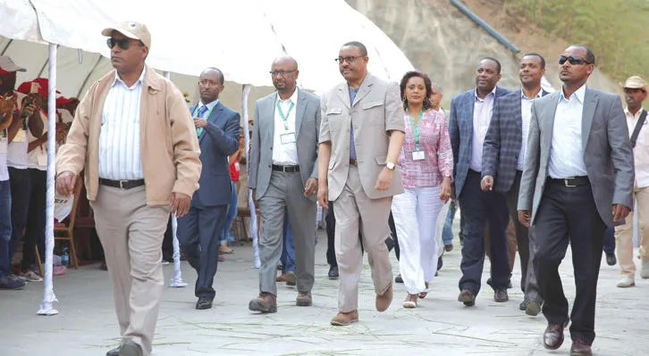 رئيس الوزراء الإثيوبي هيلي ماريام ميسالين يتقدم المشاركين في احتفالات تدشين سد «جيب 3» الذي يعرف باسم سد «النهضة» في العاصمة أديس أبابا أمس (أ.ف.ب)