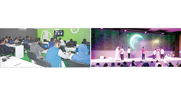 إحدى المسرحيات المقامة على هامش الفعاليات - الشباب يتدربون على استخدام أحدث التقنيات المتاحة («الشرق الأوسط»)