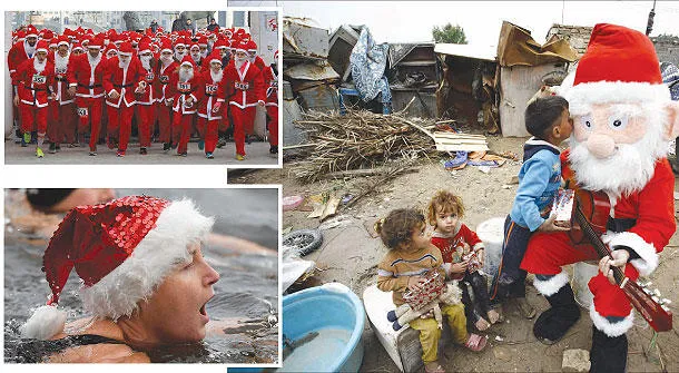 بابا نويل العراقي يوزع الهدايا على الأطفال الفقراء بمدينة النجف (أ ف ب) - متسابقون بزي بابا نوبل في عاصمة مقدونيا سكوبيه - تحتفل بالميلاد في بحيرة بهايد بارك في لندن (رويترز)